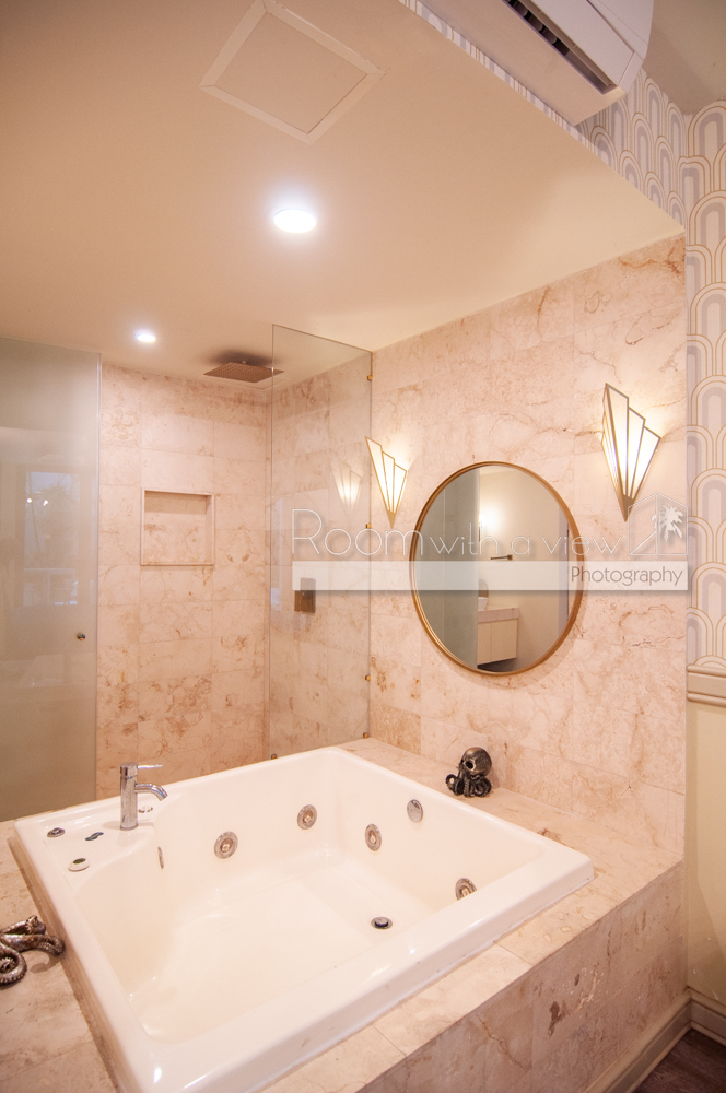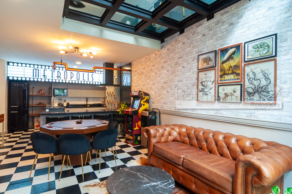 Inside, the decor leans into a fun, entertainment-inspired theme with checkered floors, exposed brick, skylights, and gold accents that give the space its own personality. There’s a gaming table, a classic pinball machine, and even a lighted Metropolis sign glowing above the kitchen. In the primary bedroom, you’ll find a private jacuzzi for winding down at the end of the day. Residents and guests also enjoy access to a rooftop pool, a fitness center, a co-working area, front desk service, elevator access, Wi-Fi in the common areas, and 24-hour security.