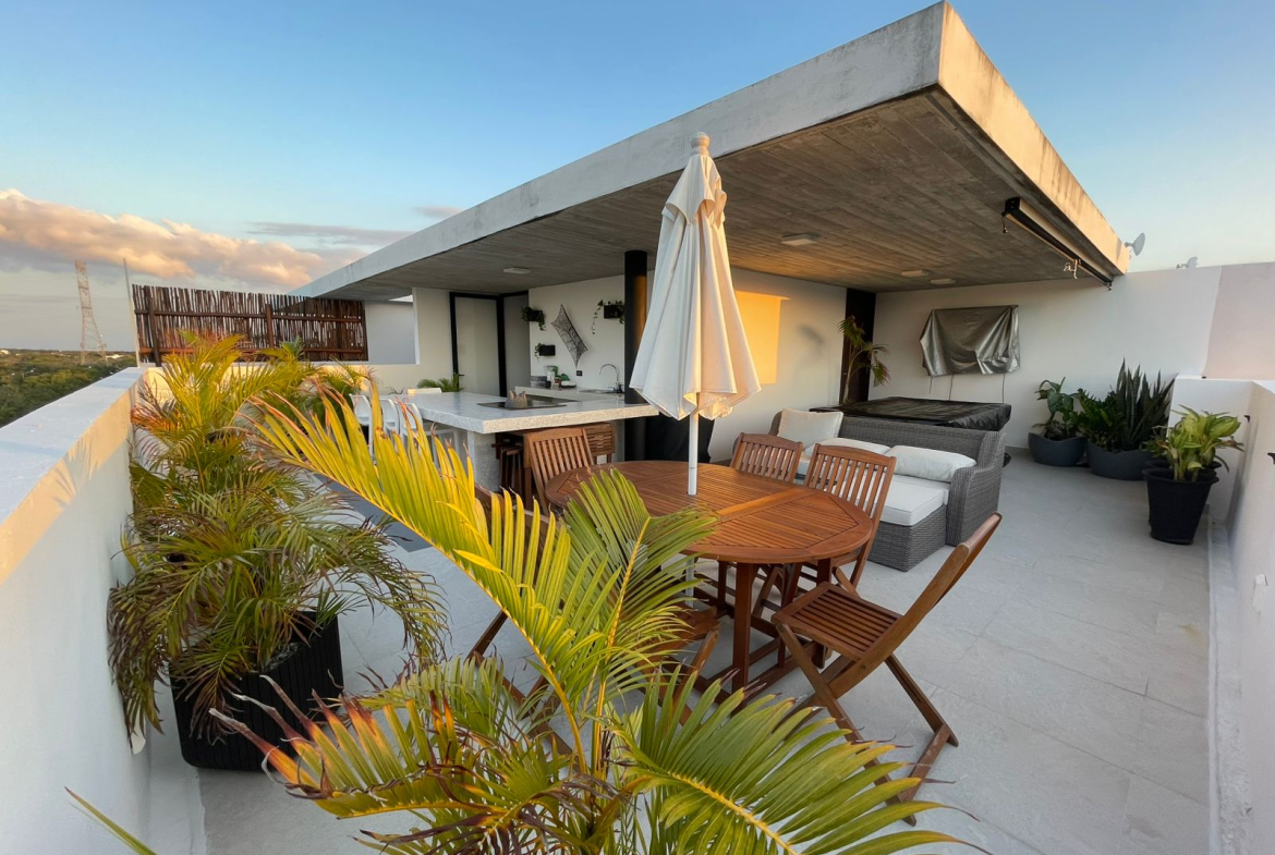This updated 3-bedroom penthouse, offered unfurnished, boasts high ceilings, walk-in closets, and a spacious private rooftop terrace with a bar, perfect for relaxing or entertaining. Located in the heart of Ciudad Mayakoba, the Riviera Maya’s first sustainable master-planned community, it combines exclusivity and privacy with convenient access to stunning beaches.